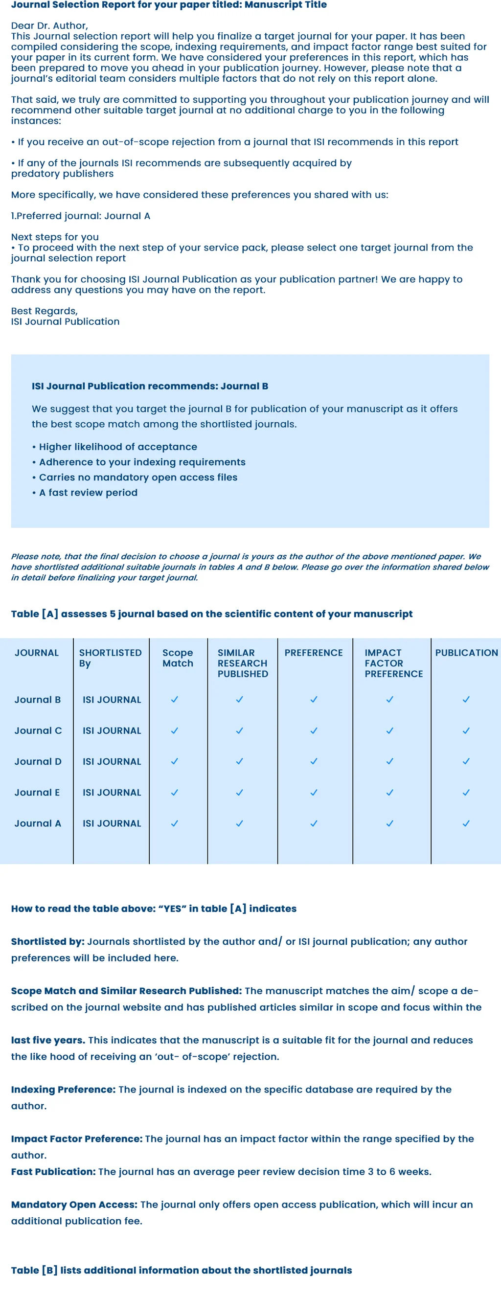 In our journal selection services, we provide a journal selection report to assist you in deciding on a publication for your paper. It is carefully constructed with your specific preferences in mind, taking into account the scope, impact factor range, and indexing needs best suited for your article in its current state.